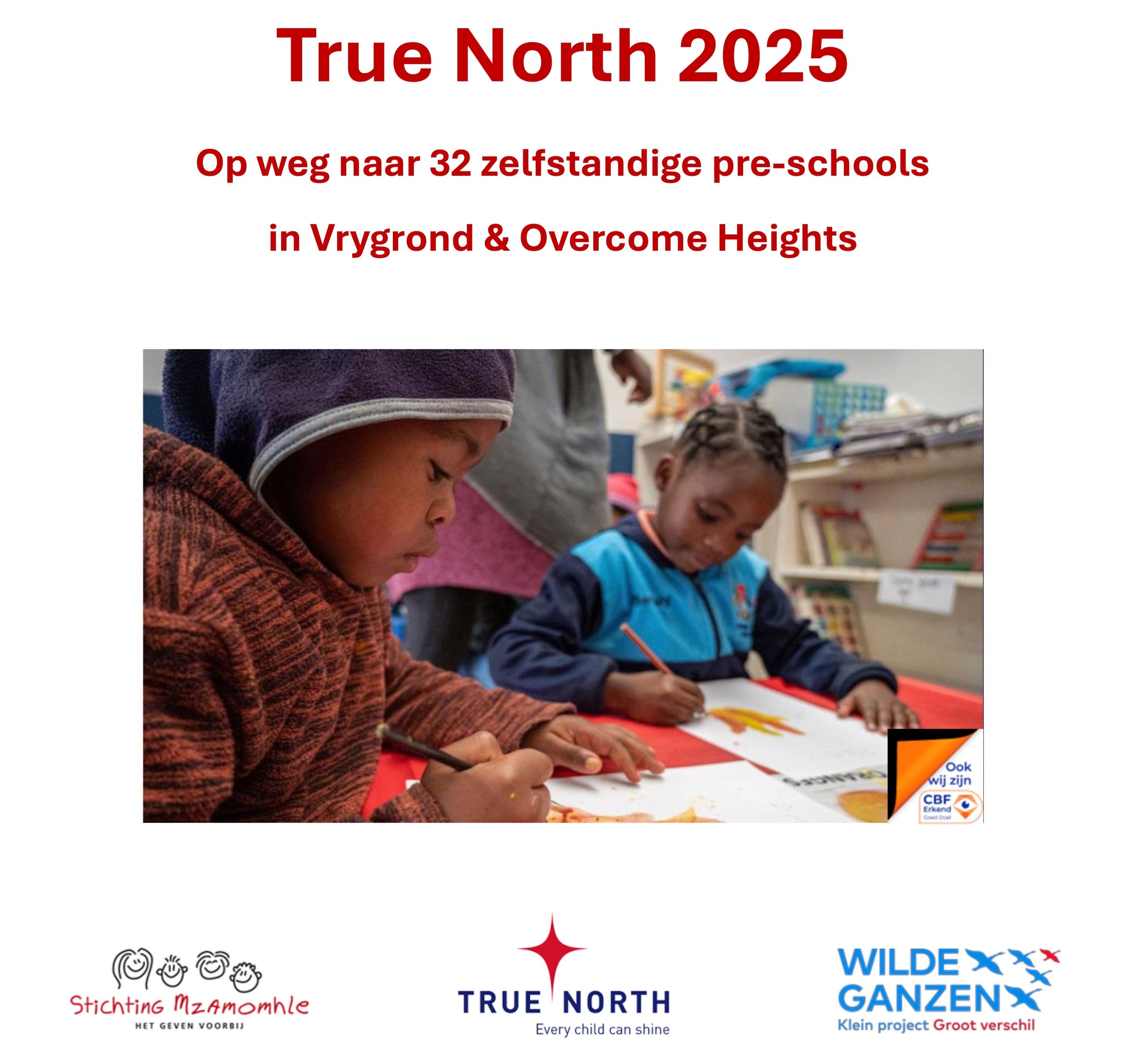 True North werkt steeds met oog voor het kind, de ouders, staf en gemeenschap in Vrygrond en Overcome Heights met als ultiem doel jezelf as organisatie overbodig te maken. Met nog twee-en-een-half jaar te gaan tot overdracht aan een nieuw, lokaal managementteam dragen wij dit jaar bij aan het verstevigen van het fundament; Principal training, curriculum (herhalings) training voor onderwijzers en opleiding van vier stafleden/principals tot gekwalificeerde assessors. Daarnaast dragen wij graag bij aan de voor het curriculum benodigde uitrusting.